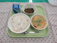 キムチご飯、牛乳、ワンタンスープ、杏仁豆腐(あんにんどうふ) です。
