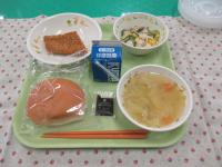 ひじきご飯、牛乳、鮭のなかおちソフトカツ、具だくさんみそ汁 です。