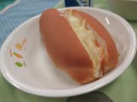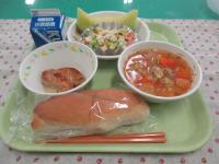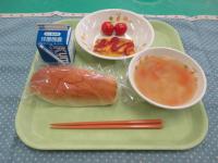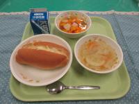 セルフドッグ(コッペパン&ウインナーソーセージ)、牛乳、トマトと卵のスープ、ポテトサラダ です。