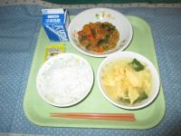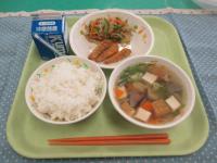 麦ご飯、牛乳、豚肉とチンゲン菜のピリ辛炒め、コーンスープ、中華ふりかけ です。