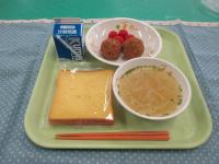 ミルクパン、牛乳、枝豆と豆腐のミンチカツ、トマトだんごのスープ、シーザーサラダ です。