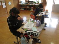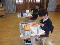 4年生の図工では、ビー玉を転がして遊ぶものを作っています。必要な材料は自分で準備し、すべり台のようなものをつくって、ビー玉を転がします。うまく転がるように、少しずつ調整しながら作っていきます。うまくいったときは、うれしいものです。いろいろ工夫して、楽しいものつくってほしいを思います。