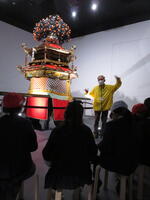 下から見上げる傘鉾は圧巻!豪華な飾りや祭りの由来などを詳しく伺うことができました。また、エントランスの展示「八代のまつり」の中には、坂本の伝統行事をみつけ、興味深く見ていました。