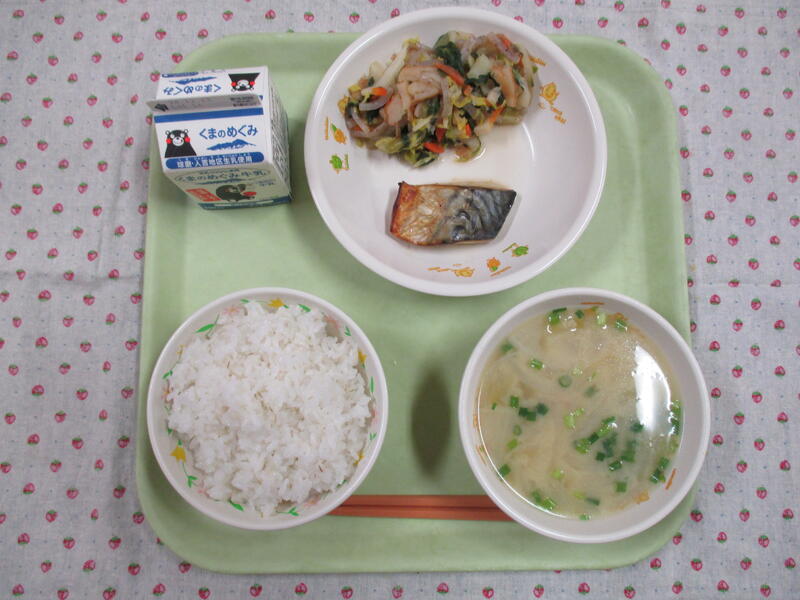 今日の献立は、麦ごはん、牛乳、さばの塩焼き、呉汁、菜焼きでした。今月の和食を味わう日は、主菜がさばの塩焼き、副菜が野菜をたくさん使った菜焼き、汁物には、すりつぶした大豆が入った呉汁を組み合わせた一汁二菜でした。呉汁は熊本の郷土料理です。今日は和を感じながら、おいしくいただきました。