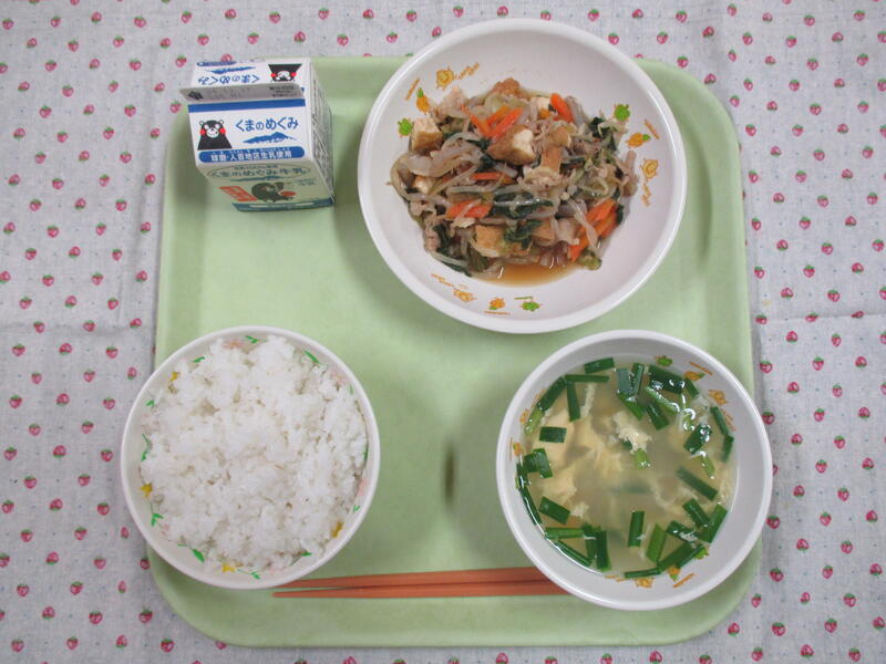 今日の献立は、麦ご飯、牛乳、レバーのケチャップ煮、野菜スープでした。