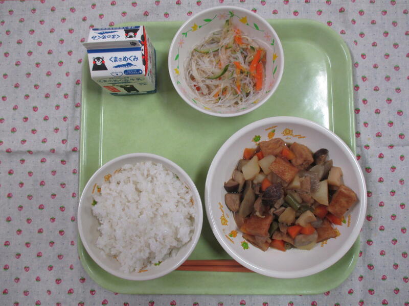 今日の献立は、五目ご飯、牛乳、みそおでん、ごま酢和えでした。