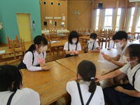 「星は明るさによって、一等星、二等星・・・と分けられますが、一番明るいのは何等星?」のクイズに、5・6年生は「一等星です」と、さすがの正解でした。「へぇ、そうなの?」と、4年生にとっては勉強になったようです。