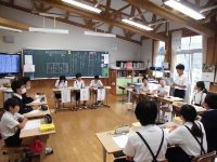 総合:ただのトランプゲームではありません。来週、町内の施設との交流で行う内容を、班ごとにプレゼン中です。プレゼンの後はよりよいものにしていくために互いにアドバイスを行いました。