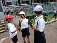 1・2年生で育てているキュウリが、大きく育って実をつけました。