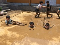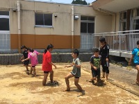 掃除の後の時間は、恒例の水遊びをしました。今日限定の、水が入っていないプールを楽しんだ子どもたちでした。