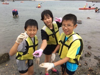 集団宿泊教室の2日目を迎えました。朝のつどいでは、ラジオ体操や学校紹介などがありました。マリン活動は、荒天のためペーロンはできず、磯観察になりました。箱メガネで水中をのぞくと、魚や貝などの多くの生物を見ることができました。