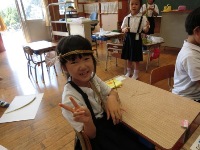 校庭をあちこち散歩して、みんないろんなものを見つけてきました。集めたものを自由に並べたり、頭に飾ったりして楽しみました。ススキのかんむりが、とてもかわいくできていました。