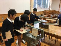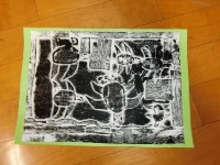 作り、黒いインクを使って刷りました。手や服を真っ黒にしながら、一生懸命刷り上げました。友だちと協力して上手にできました。でき上がった作品をお互いに見ながら、「楽しかった!!」と大喜びでした。