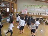 「鬼は外、福は内!!」と元気よくかけ声をかけながら、豆まきをしました。豆は、床に落ちても食べられるように落花生。鬼になった逃げ回る子どもたちに豆をぶつけながら、楽しく豆まきをしました。最後は、拾った豆を10個ずつ分け合って食べました。さあこれで、健康で元気に過ごせるかな? 願いを込めた楽しい行事でした。