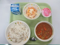 給食室の先生からお聞きしたところ、だごは、トマトの水分だけ(水は加えていない)で作られたそうです。すごいですね。トマト100%のだごは、色がエビのように赤く、かめばかむほどトマトの酸味がほのかにしておいしかったです。