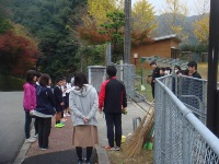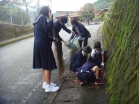 中学校の生徒さん達と一緒に、登校坂の落ち葉拾いをしています。