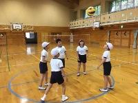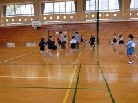 授業のはじめは、円をつくってトスをつなぐ練習をしています。