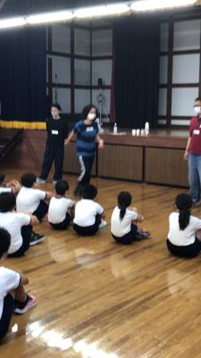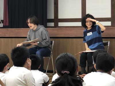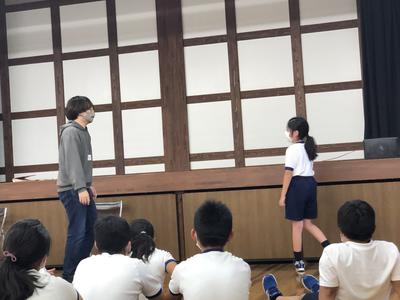 午前中は低学年、午後は高学年が、いろいろな演劇のワークショップを体験します。池田美樹代表をはじめ、きららの皆さんに巧みな表現力に引き込まれ、1年生から3年生のみんなは、開始直後からノリノリです。声色を変えたり、想像力で体を動かしたり、みるみる自己表現力がついています。プロの指導に脱帽です。