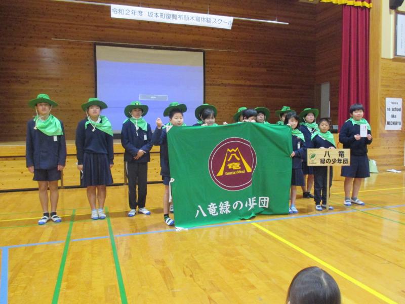 そして、ブータンのお土産として、「ルンタ」をいただきました。この旗が風でひらめくと「幸せ」がおきるそうです。八竜小みんなに幸せがおきるよう大事に飾らせていただきました。