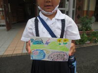 この暑中見舞いは、昨年の豪雨災害で坂本町を離れ、仮設住宅やみなし仮設で生活されている一人暮らしのおじいちゃんやおばあちゃんに、メッセージを書いたものです。夏の風景のイラストを2年生が考え、文章は運営委員会の6年さくらさんが考えてくれました。