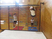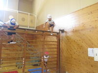 「肋木の壁越え」では、マットへの飛び降りが上手になりました。着地の後崩れていては敵にやられてしまいますので、素早くマットからもおります。また、忍者になりきった1年みゆさんは、肋木頂上のまたぎ越しに初めて成功。「怖さ」を克服し一人でできる姿に担任宮本先生も大喜びでした。