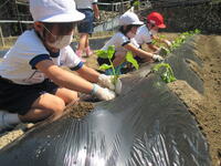 山﨑さんのご指導ものと、「おいしく育て、おいしく育て」と願いを込めて、みんな上手に植えることができました。その後に、なんと山﨑さんからのご褒美もあり、大満足の子供たちでした。