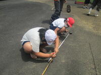 まずは、メジャーや竹に印をつけて、田植えの準備をします。