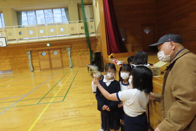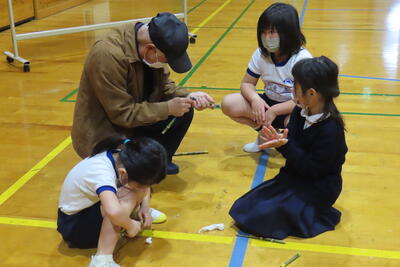 たくさんの昔遊びに出会うことができ、充実した時間となりました。遊んだおもちゃは、ご厚意で子どもたちにプレゼントしていただきました。学校には、木製の鳥をいただきましたので、玄関に飾りたいと思います。ありがとうございました。