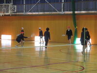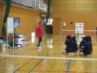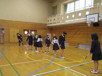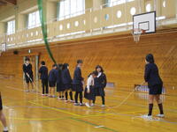 その後、体育館で体育の模擬授業で「ソフトテニス」を体験。