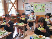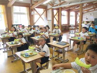 郡築のメロン農家、田浦秀秋さん、かおりさんから、立派な肥後グリーンをいただきました。肥後グリーンは、八代の特産、大きくて甘いメロンです。災害後から毎年、八竜小の子供たちのために寄贈してくださっています。今年も立派なメロンをいただき、今日の給食に登場しました。おかわりのメロンもあり、みんな、おなかいっぱいになりました。