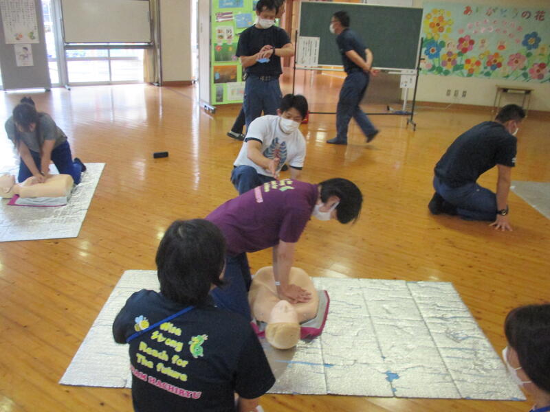 来週から水泳学習が始まります。水泳学習の前に、八代消防署坂本分署の方々に来ていただき、「救急救命法」の研修を行いました。