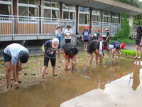 5年生は、初めての体験でなかなか田んぼの中に足を入れようとしません。腕をいっぱいに伸ばして植えようとしますが、そのうちに届かなくなり… やっと、はじめての一歩を踏みだすことができました。