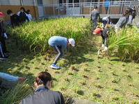 秋晴れの中、しっかり実った学校園の稲刈りを行いました。