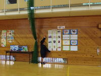 体育館壁面には、学年ごとの掲示やクラブ活動の作品、坂本中学校からの作品等もありますので、空いている時間にご覧ください。