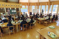 チャイムがなったら、給食当番の5年生が大急ぎで準備を始めました。