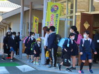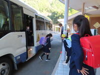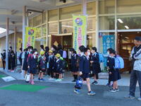 小学校は、バスを降りた人から順番に、全員で挨拶運動を行っています。