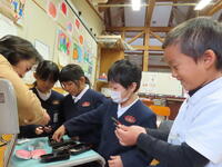 1年生教室では、紙芝居の中に登場した磁石の実物を持ってきていただいており、読み聞かせが終わった後に、さわって遊んでいる様子が見られました。
