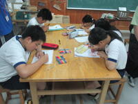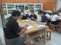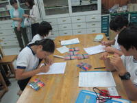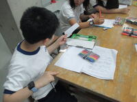 1日目の夜にはプラホビーをつくりました。プラ板にそれぞれ好きな絵を描きました。プラ板をオーブントースターに入れると小さくなり、キーホルダーをつくりました。先生たちも一緒に集中してつくりました。