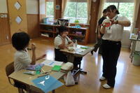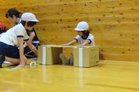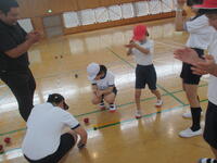 今週は、体育館で鬼ごっこをしました。自由に動くことができる鬼ごっこではなく、体育館の床にある緑と黄色の線の上だけを移動していきます。子供たちが考えたルールで、みんな息を切らしながら走り回っていました。