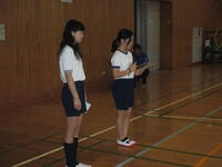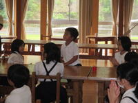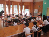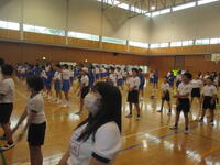 2日目は6時30分に起床です。7時からは朝の集いがあり、八代第2中学校と一緒でした。代表が八竜小の紹介をし、全員でラジオ体操をしました。