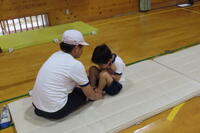 次に、訓練です。給食中に児童がミニトマトをのどに詰まらせたという想定です。背中をたたいて、のどに詰まったトマトを出し、救急車が来るまで心臓マッサージを行います。119番通報をしたり、他の児童を誘導したりする役割もあります。緊張感のある訓練でした。
