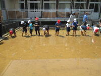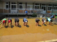 今日は、4~6年生では泳力調査、1・2年生では鬼ごっこ、そして全学年で渦巻き作りや自由遊びを行いました。