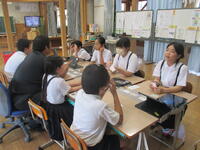 国語では、対話についての学習が始まります。5・6年では、対話の学習に向けたトークタイムを行いました。「好きな食べ物は何ですか?」「好きなテレビ番組は何ですか?」「悲しくなることは何ですか?」「理想の1日を教えてください」など、トークテーマを書いたカードを引き、テーマに沿って話します。聞き手は、相手の目を見て、時にはうなずきながら聞きます。夏休み明けて3日目ですが、活発なトークができていました。