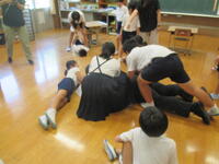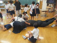 今日の心のケアタイムは「大根ぬき」でした。大根役の子供たちが床にうつぶせになり、となりの友達と手をつなぎます。他の友達が、大根役の友達の足をひっぱり、大根を抜こうとします。大根役の子供たちは、抜かれないようにとなりの友達と手が離れないようにしっかり手を握ります。