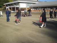 最後は、分署の方の指導のもと、消火器の使い方を学びました。キーワードは「ピ(ピンをぬく)ノ(ノズルを伸ばす)キ(キョリをとる)オ(おす)」です。6年生が実演をしました。「火事だ~」と叫んで、消火活動です。しっかりお手本を見せることができました。