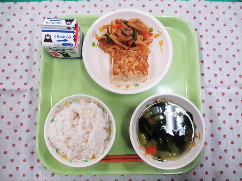 菜めし、牛乳、肉詰めいなり、お野菜つみれ汁、茎わかめのきんぴら