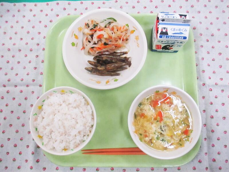 「わかめ」には、葉・茎・めかぶ・根があり、今日の給食には「茎」の部分を、たけのこ・人参・コンニャクときんぴらに炒めてあります。コリコリした食感がたまりません。