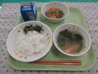 ご飯、牛乳、高野豆腐の卵とじ、沢煮椀、手作りふりかけ です。