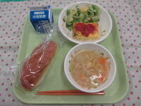 今日の献立は、コッペパン、牛乳、ベジタブルチャウダー、ホキフライ、グリーンサラダでした。