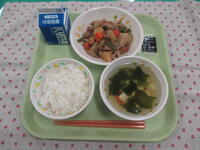 麦ご飯、牛乳、豚肉とチンゲン菜のピリ辛炒め、コーンスープ、中華ふりかけ です。
